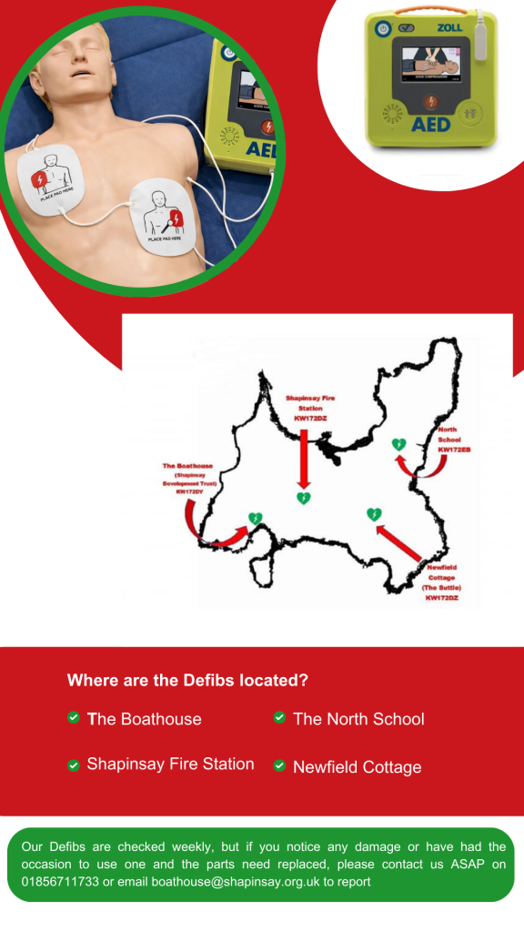 Shapinsay Development Trust have purchased 4 Defibrillators and have them dotted around the island as follows: