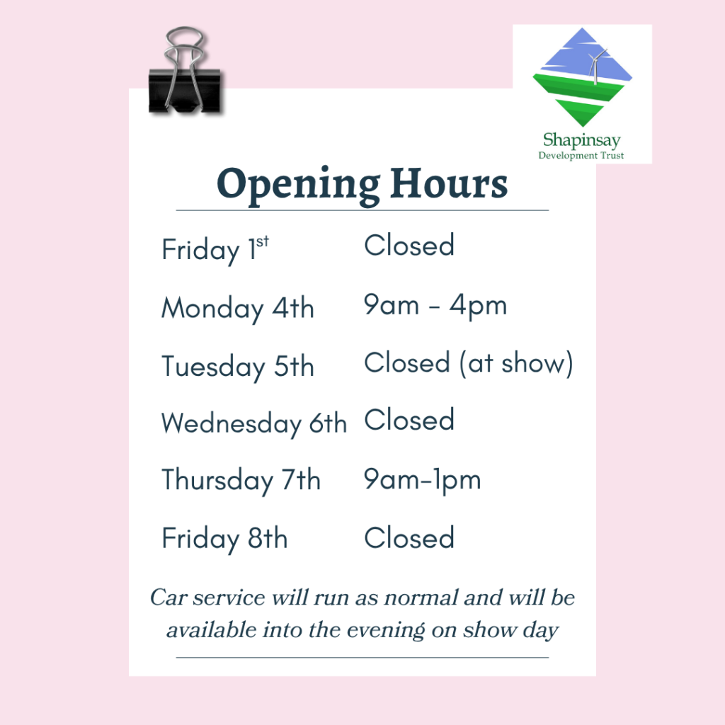 Due to staff annual leave, The Boathouse will be closed a few days over the next week or so. We will be at the show park on Shapinsay show day, come and say hi! and bring your wellbeing tree leaves over with your suggestions for the wellbeing project (find out more in the Shapinsay Sound)